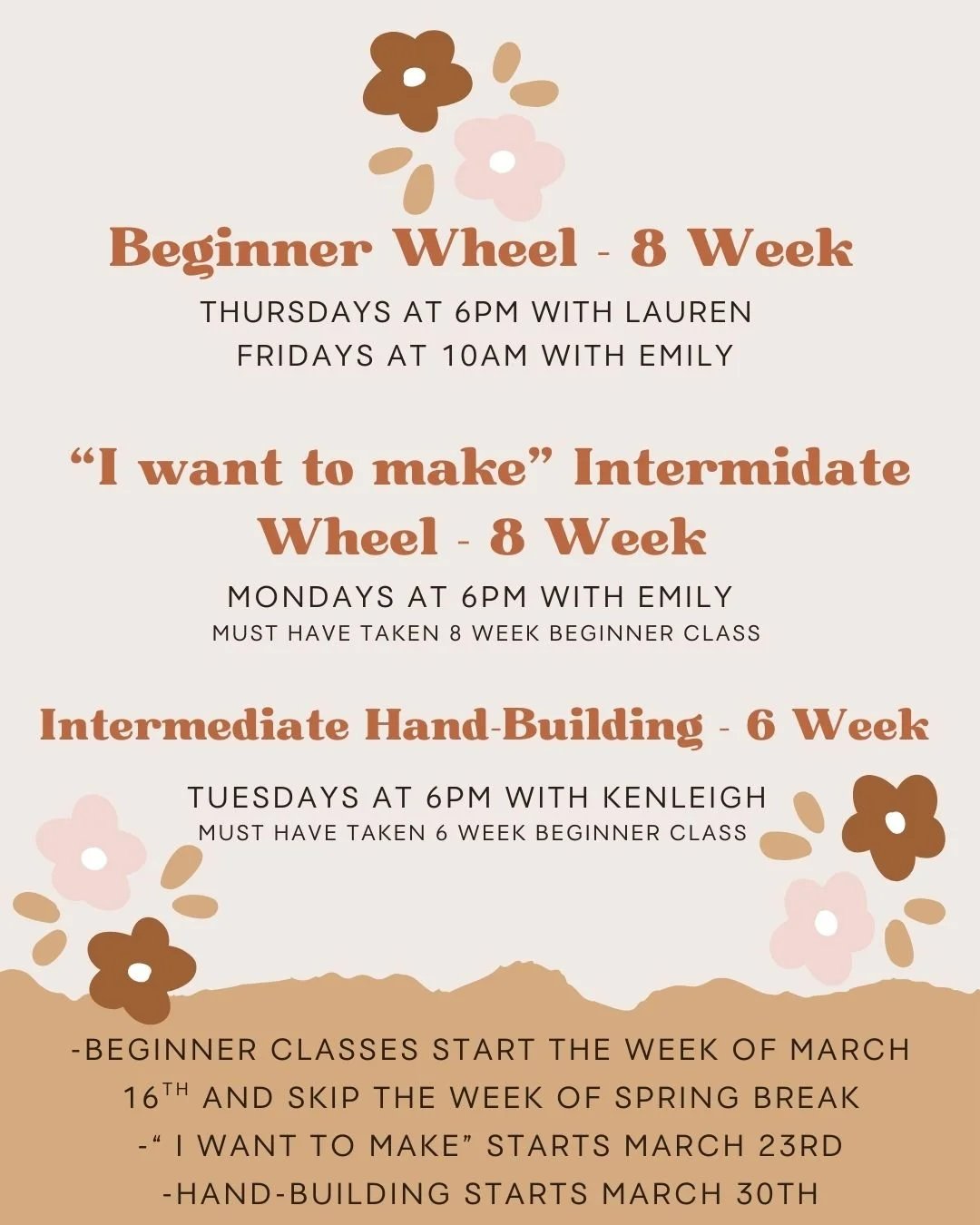 Ready to jump in? Join us for an 8 week wheel class or a 6 week handbuilding class. Not only do our students get 2 hours of instruction per week, they gain access to our studio during our open studio hours (we are open 7 days a week!). Also included- 6 lbs of white stoneware, 6 lbs of brown stoneware clay, a dedicated shelf for works in progress, a Muddy Pig tote bag and a personal tool kit!